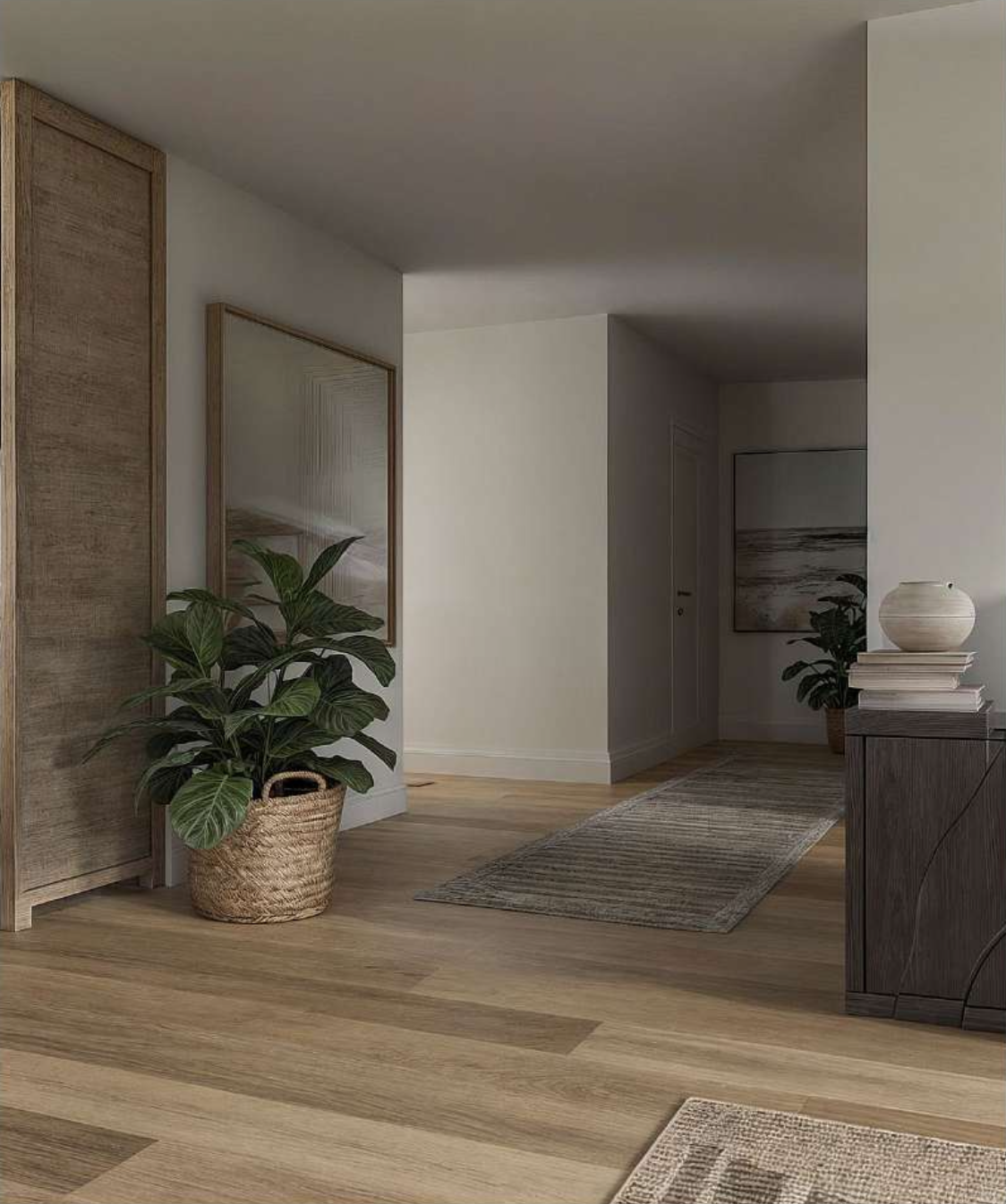 A clean, minimalist home design featuring warm wood tones and simple, natural elements.